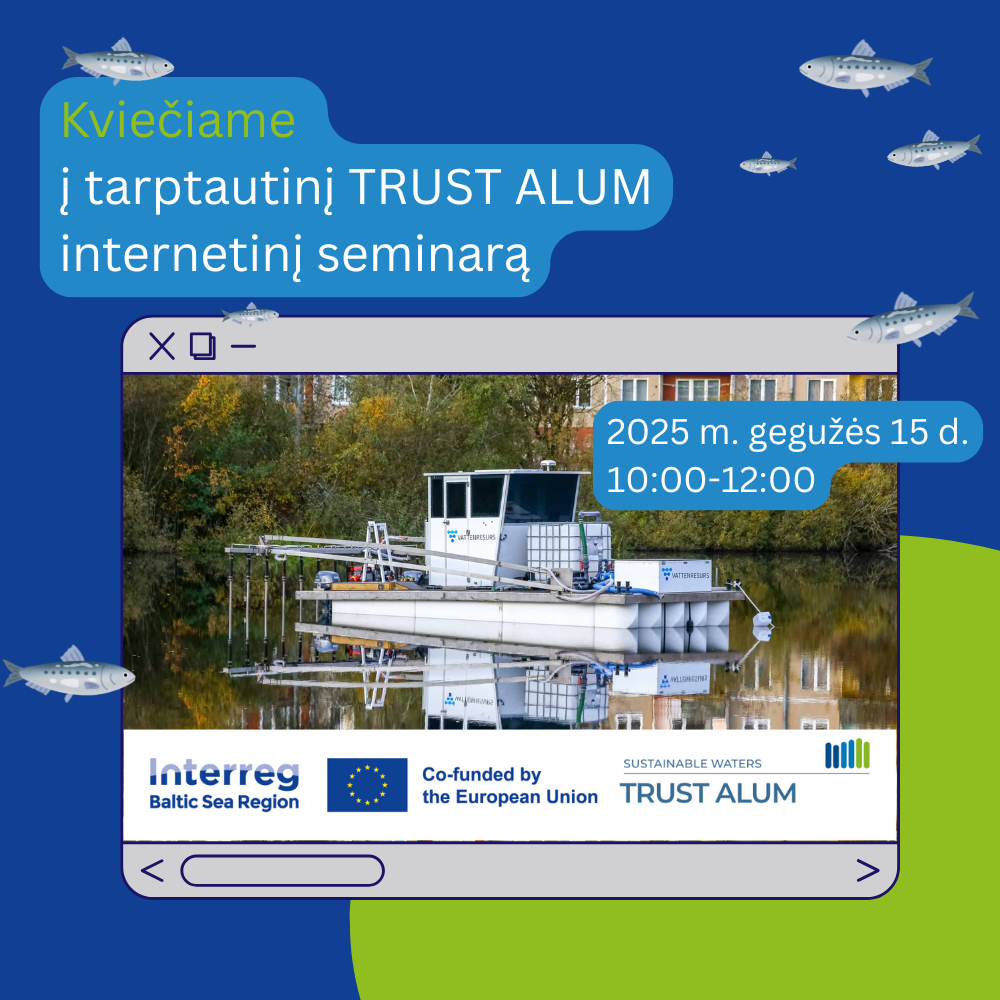 Kviečiame į tarptautinį TRUST ALUM internetinį seminarą, kuriame bus išsamiai pristatyta ežerų valymo aliuminio preparatais tema. Renginys vyks anglų kalba 2025 m. gegužės 15 d. nuo 10:00 iki 12:00 val.